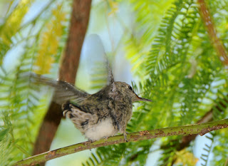 This baby hopped away from the nest and sat on a branch not at all afraid of me and my lens - look at those downy feathers on her bum. |